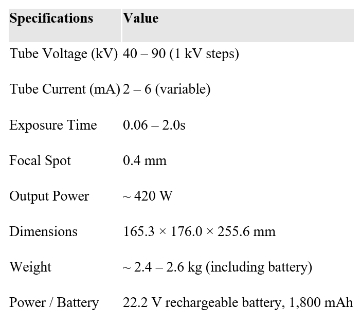Equipped with adjustable tube voltage up to 90 kV and tube current up to 6 mA, imaging is optimized for clarity while keeping radiation exposure minimal. The short exposure times (0.06 to 2.0 s) enable sharp, motion-free images — and acquisition occurs in under 3 seconds. A 0.4 mm focal spot ensures high spatial resolution, supporting accurate bone and soft tissue visualization. Remote control operation allows flexible workflow in varied clinical settings.
